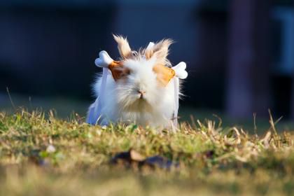 红眼睛,白皮袍,短尾巴,长耳朵。爱吃青菜和萝卜,走起路来蹦蹦跳。 (打一动物)